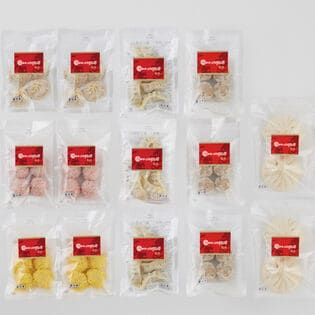 ・原材料/材質/素材:【餃子】野菜(キャベツ(国産)、白菜、にら、長ねぎ、にんにく、しょうが、玉ねぎ)、豚肉、ラード、豚脂、粒状大豆たん白、オイスターソース、植物油(ごま油、大豆油)、醤油、チキンパウダー、でん粉、味噌、昆布茶、ゼラチン、砂糖、食塩、香辛料、焼酎、皮(小麦粉、還元水飴、大豆油、こんにゃく粉)/酒精、トレハロース、調味料(アミノ酸等)、重曹、カラメル色素、香料、酸味料、(一部に小麦・豚肉・大豆・ごま・鶏肉・ゼラチンを含む)【手包み肉まん】皮(小麦粉(国内製造)、砂糖、イースト、ラード、食塩)、豚肉、野菜(玉ねぎ、しょうが、長ねぎ)、しいたけ、パン粉、醤油、植物油(ごま油、大豆油)、ラード、砂糖、清酒、食塩、粒状植物性たん白、中国醤油、醸造酢、ゼラチン、香辛料/ベーキングパウダー、調味料(アミノ酸等)、酸味料、(一部に小麦・乳成分・大豆・豚肉・ごま・ゼラチンを含む)【貝柱入焼売】豚肉(輸入)、玉ねぎ、粒状大豆たん白、でん粉、豚脂、オイスターソース、砂糖、醤油、大豆油、干し貝柱、ごま油、食塩、香辛料、皮(小麦粉、食塩)、/調味料(アミノ酸等)、セルロース、カラメル色素、酸味料、(一部に小麦・大豆・豚肉・ごまを含む)【小籠包】豚肉(輸入)、ゼラチン、醤油、砂糖、オイスターソース、ごま油、チキンコンソメ、しょうが、長ねぎ、香辛料、皮(小麦粉、でん粉、砂糖、ラード、植物油)/調味料(アミノ酸等)、カラメル色素、(一部に小麦・乳成分・大豆・牛肉・豚肉・鶏肉・ごま・ゼラチンを含む)【錦糸焼売】魚肉[いとより(タイ産)、いか]、野菜(玉ねぎ、くわい、やまいも)、豚脂、大豆油、みりん、しょう油、でん粉、卵、こんぶ茶、食塩、皮(卵、小麦粉、砂糖、食塩、植物油脂、米醸造調味料)/ソルビトール、カロチノイド色素、調味料(アミノ酸等)、甘味料(カンゾウ)、(一部に小麦・卵・いか・大豆・豚肉・やまいもを含む)【珍珠丸子】豚肉(輸入)、もち米、えび、粒状大豆たん白、野菜(にんじん、セロリ、長ねぎ)、豚脂、でん粉、しいたけ、砂糖、植物油(ごま油、大豆油)、食塩、清酒/調味料(アミノ酸等)、着色料(赤102)、(一部にえび・大豆・豚肉・ごまを含む)