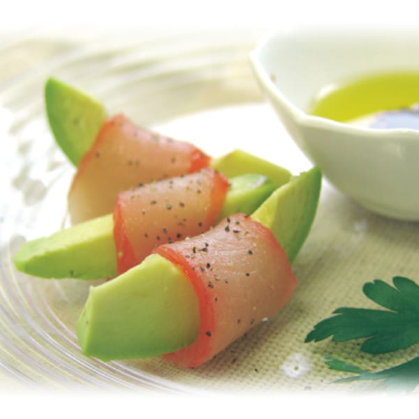鮪を生ハム仕立てに仕上げスライスしました。燻の薫りとしっとりしたまぐろの生ハムを野菜と一緒にお召し上がりください。