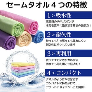 何度でも再利用できて経済的なセームタオルの2枚セットです。吸水性抜群で、様々なシーンで便利にご利用いただけます。タオルのようにかさばらず、コンパクトに持ち歩け、アウトドアやイベントにも便利です。