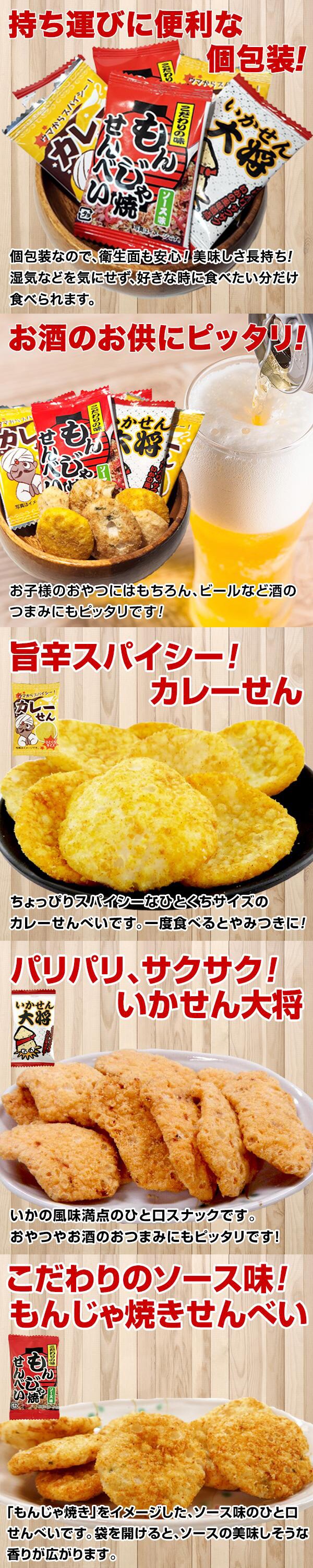 カレーせん、いかせん、もんじゃ焼きせんべいの3種の煎餅を食べ比べ!