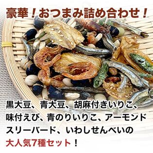 - 大容量 約1.5kg( 胡麻付きいりこ、味付えび、青のりいりこ、アーモンドスリーバード、いわしせんべい、黒大豆、青大豆の大人気7種入りのおつまみセット。)