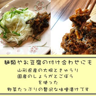 ・原材料/材質/素材: 大根、きゅうり、生姜、ごぼう、漬け原材料[味噌(大豆を含む)、砂糖、オリゴトウ、しょうゆ(大豆・小麦を含む)、風味調味料]、調味料(アミノ酸等)、酒精、乳酸、香辛料、酸味料、甘味料(ステビア)、香辛料抽出物、保存料(ソルビン酸K)