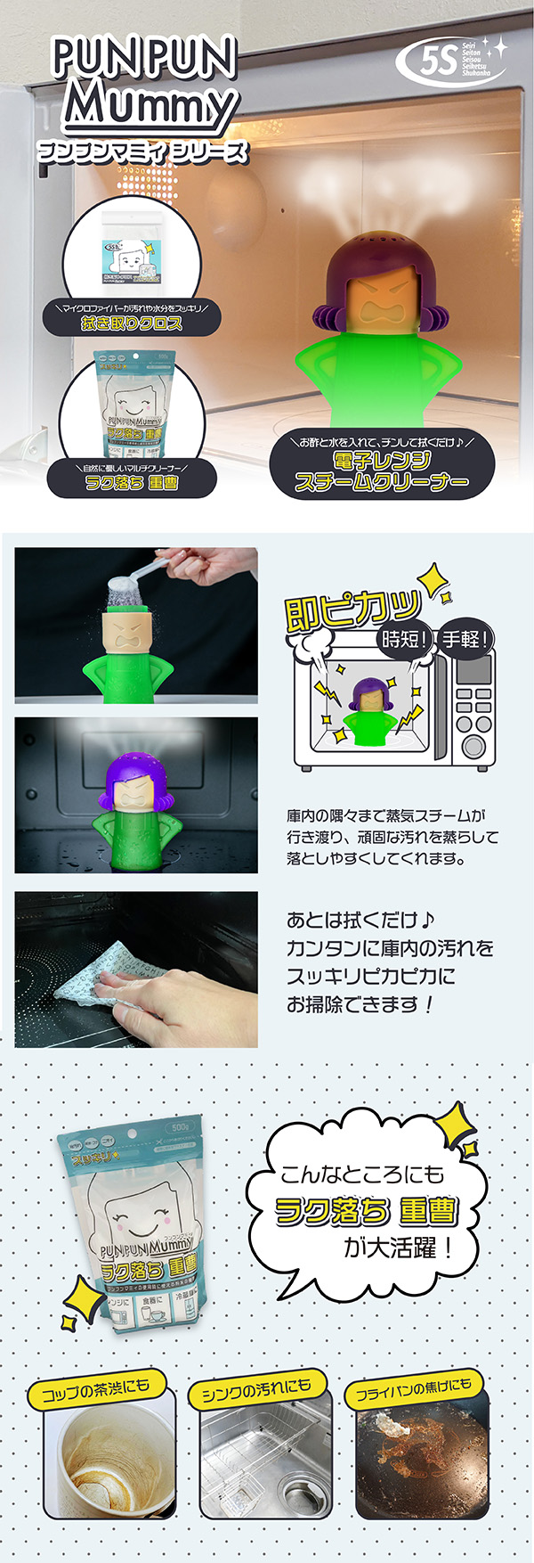・原材料/材質/素材:プンプンマミィ本体:PP ラク落ち重曹:炭酸水素ナトリウム、過炭酸ナトリウム 拭き取りクロス:ポリエステル
