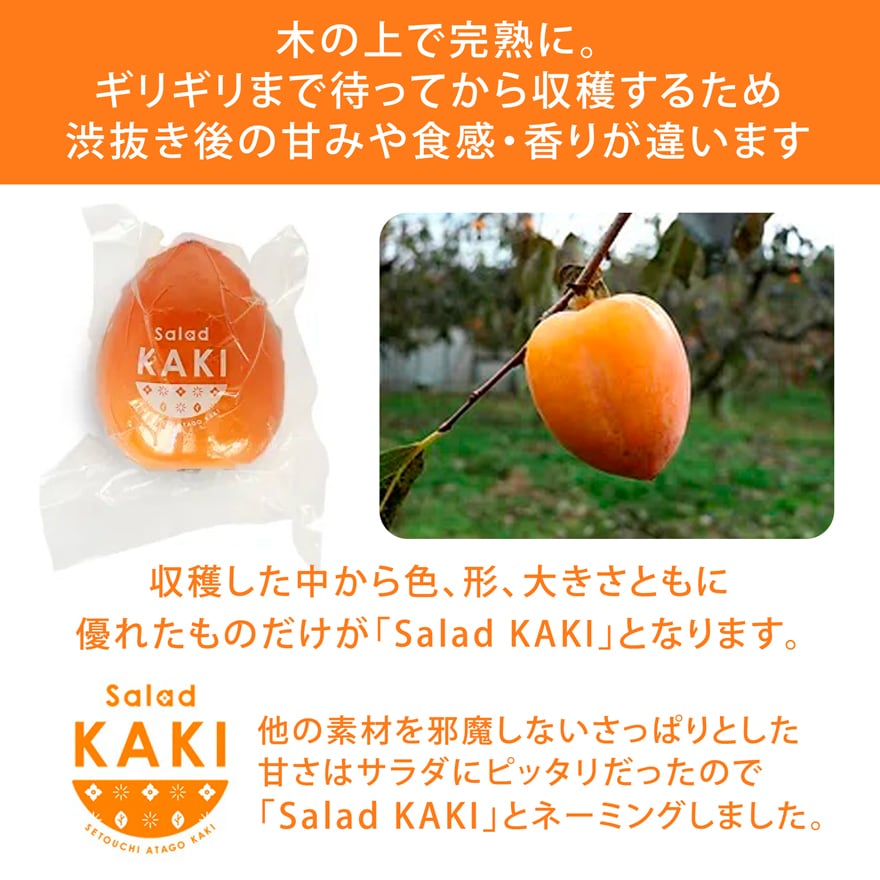 香川県三豊市は、温暖な瀬戸内の中でも特に日照時間が長く雨が少ない地域で、フルーツ王国と呼ばれるほど、美味しい果物ができることで知られています。ハラシモベースは、その三豊市の中でも朝晩の寒暖差が激しい山間地にあり果樹にとってはちょっと過酷な環境です。でもその分、木は頑張って栄養を蓄えようとするため、驚くほどおいしい果物が育ちます。特に、サクサクとした食感の「Salad KAKI」はひとつひとつ丁寧に渋抜きをした、ハラシモベース自慢の柿。他の素材を邪魔しないさっぱりとした甘さは、その名の通りサラダにぴったり!贈り物にも大変喜ばれています。