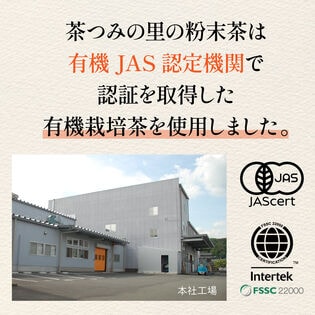 茶つみの里の粉末茶は有機JAS認定の有機栽培茶を100%使用しました。緑茶、ほうじ茶、玄米茶すべてオーガニックだから安心。