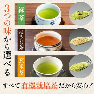 緑茶、ほうじ茶、玄米茶から選べる3種。有機JAS認定の静岡県産一番茶使用し、茶葉をまるごと粉砕しました。