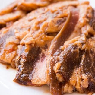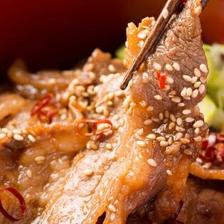 牛肉 ショートプレート(アメリカ、オーストラリア、メキシコ産)、醤油、ぶどう糖果糖液糖、おろしニンニク、水飴、植物油、砂糖、ごま、醸造酢、濃縮りんご果汁、豆板醤、胡椒、レッドベルペッパー、でん粉加工品、カラメル色素、増粘剤(加工デンプン、キサンタン)、調味料(アミノ酸等)、香辛料抽出物、ベニコウジ色素、香料(原材料の一部に小麦、ごま、大豆、リンゴを含む)