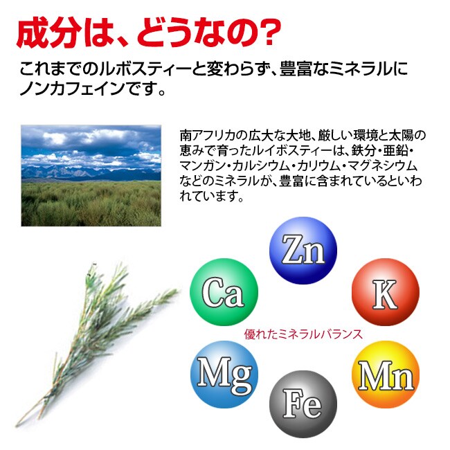 ・南アフリカの広大な大地、厳しい環境と太陽の恵みで育ったルイボスティーは、鉄分、亜鉛、マンガン、カルシウム、マグネシウム、カリウム等ミネラルたっぷり!
