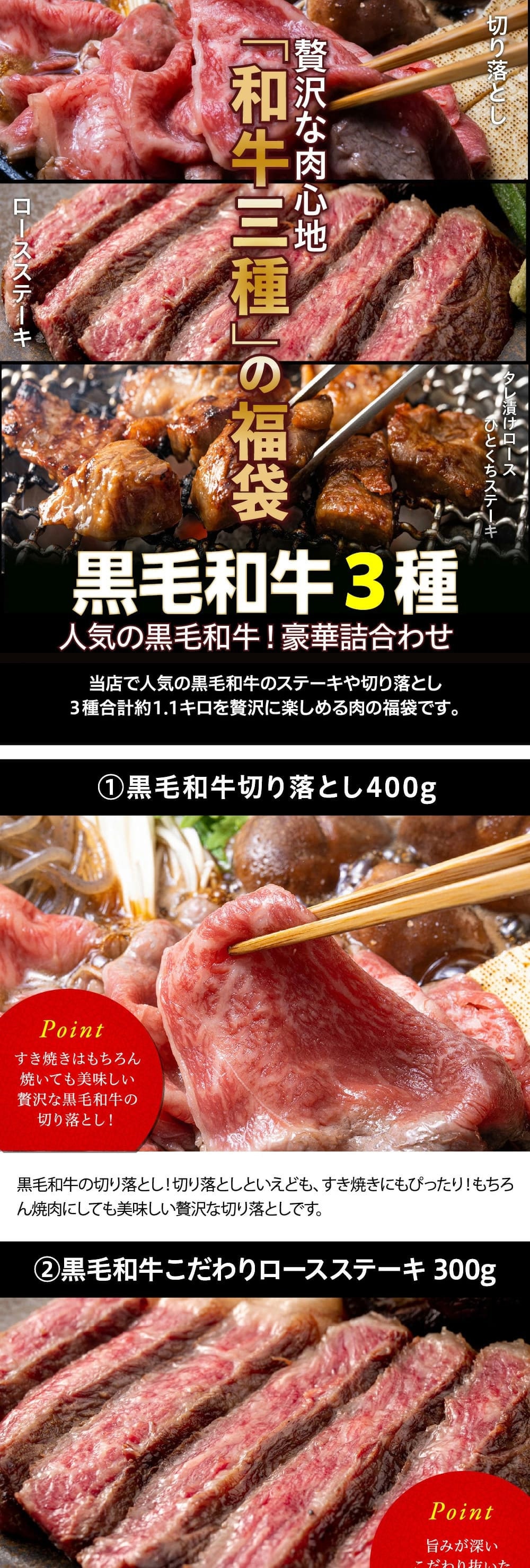 【計1.1kg】黒毛和牛三種の肉福袋 | 人気の黒毛和牛三種を贅沢に楽しめる肉の福袋!黒毛和牛ならではの濃厚な旨味を堪能して下さい!