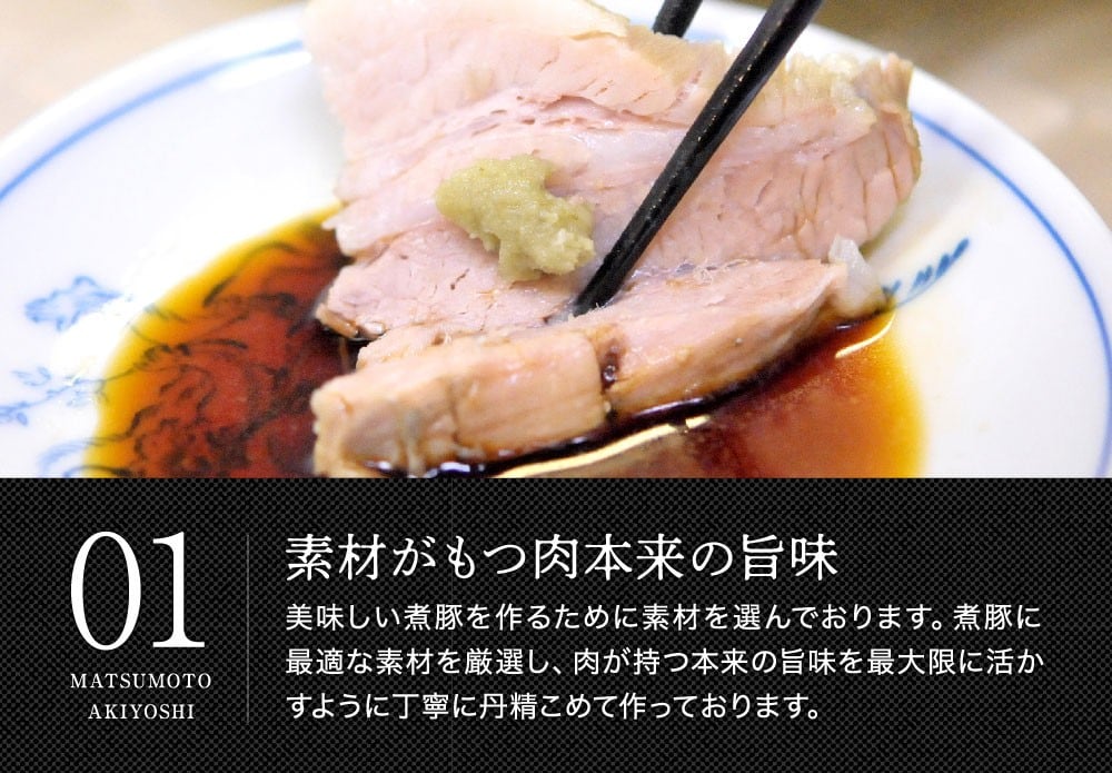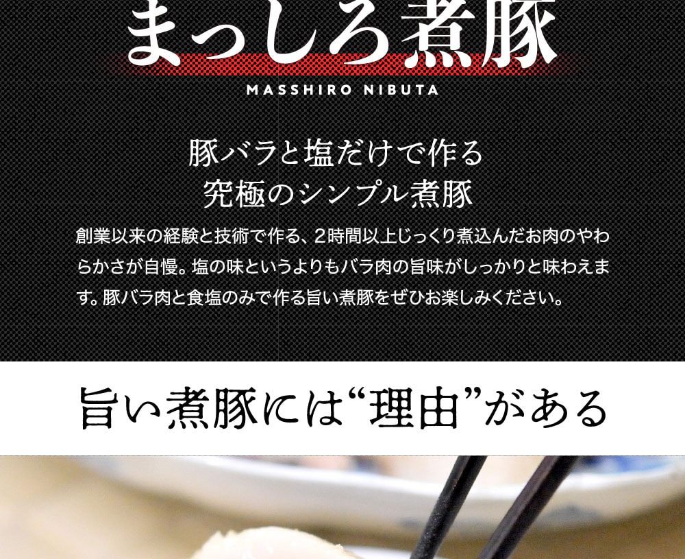 老舗60年の経験と技術で作る、2時間以上じっくり煮込んだお肉のやわらかさが自慢。塩の味というよりもバラ肉の旨味がしっかりと味わえます。豚バラ肉と食塩のみで作る旨い煮豚をぜひお楽しみください。