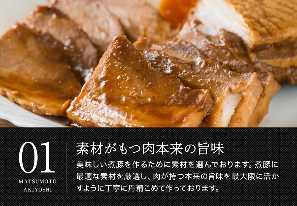 お肉のやわらかさとオリジナルで配合した八丁味噌たれで味付けした女性の方に人気の煮豚です。味噌辛くないまろやかな味で、辛くもなく甘くもない独特な味わいがお口の中で広がります。