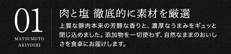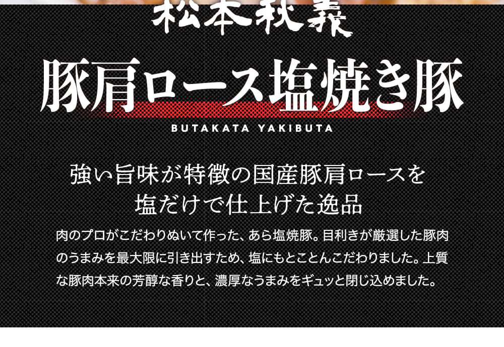 老舗60年の肉職人がこだわりぬいて作った、国産あら塩焼豚。目利きが厳選した豚肉のうまみを最大限に引き出すため、塩にもとことんこだわりました。上質な豚肉本来の芳醇な香りと、濃厚なうまみをギュッと閉じ込めました。