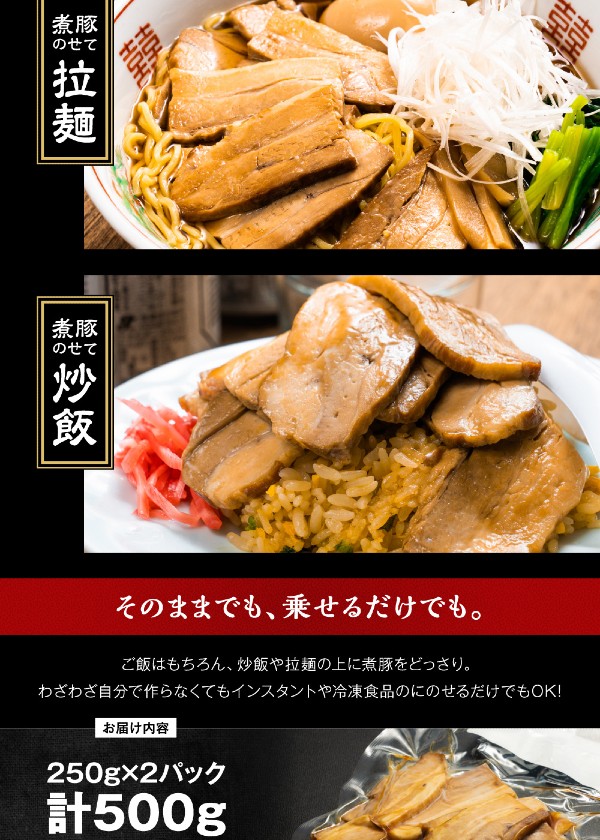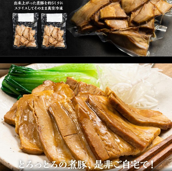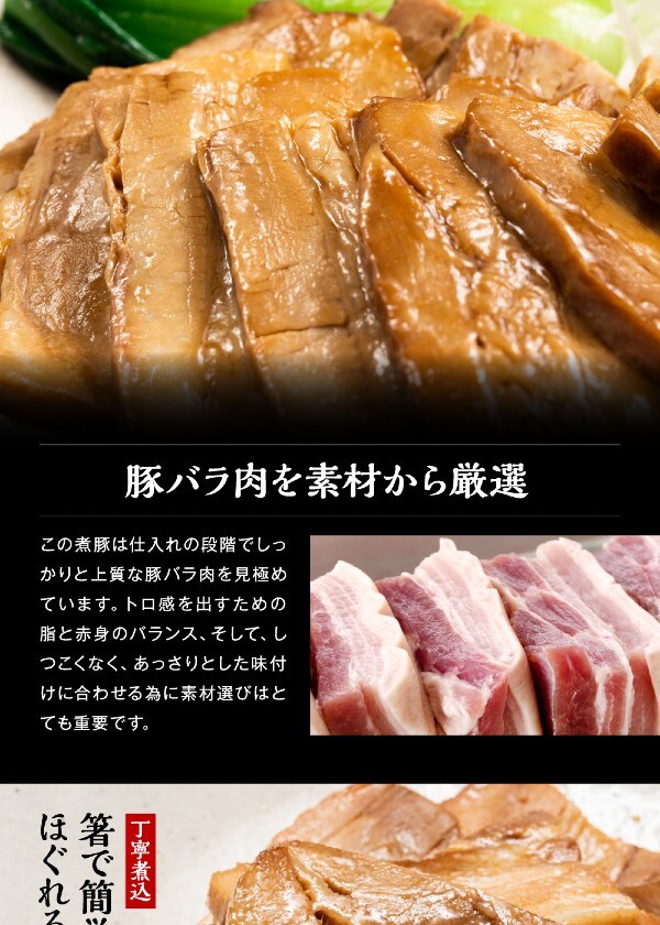 この煮豚は仕入れの段階でしっかりと上質な豚バラ肉を見極めています。トロ感を出すための脂と赤身のバランス、そして、しつこくなく、あっさりとした味付けに合わせる為に素材選びはとても重要です。脂身と赤身のバランスが取れた豚バラ肉を昔ながらの製法でじっくり仕上げています。脂は旨味を残しながらしつこさをしっかりと抜き、赤身は箸で繊維がほぐれる位まで柔らかく煮込み、タレで肉の味をごまかさない誰からも愛される味わいの煮豚になっています。そのままでも、乗せるだけでも。ご飯はもちろん、炒飯や拉麺の上に煮豚をどっさり。わざわざ自分で作らなくてもインスタントや冷凍食品のにのせるだけでもOK!とろっとろの煮豚、是非ご自宅で!
