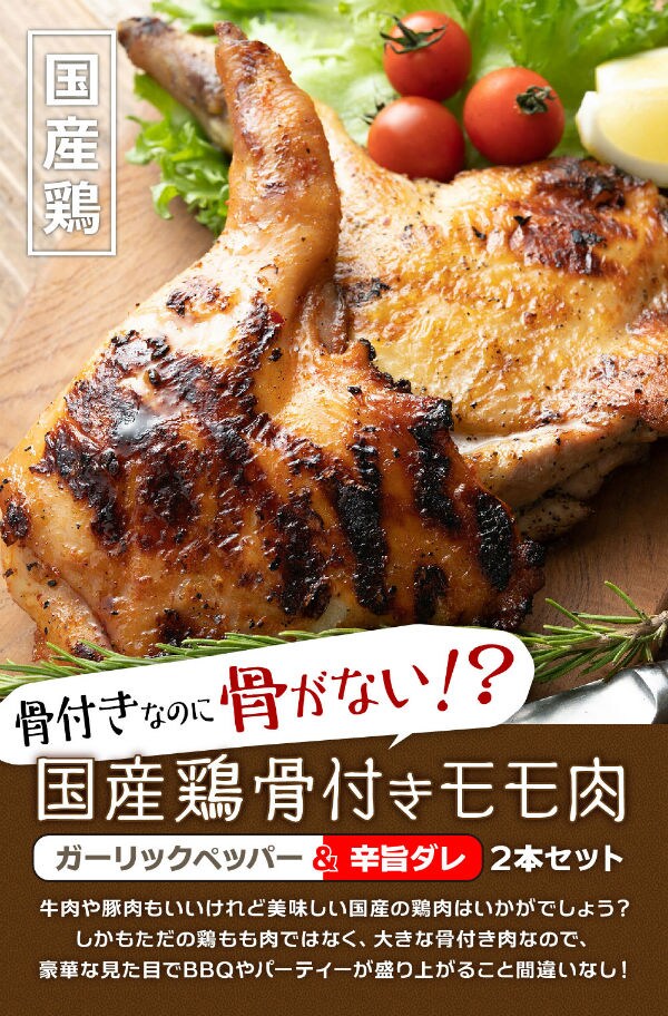 【2本】国産鶏骨付きモモ肉 (ガーリック&辛旨味) | 骨付きなのに骨がない!?徹底的に食べやすさを重視した特製タレ仕込の骨付きモモ肉!