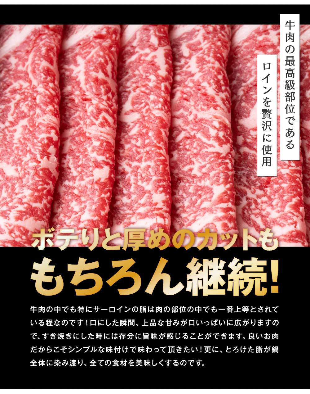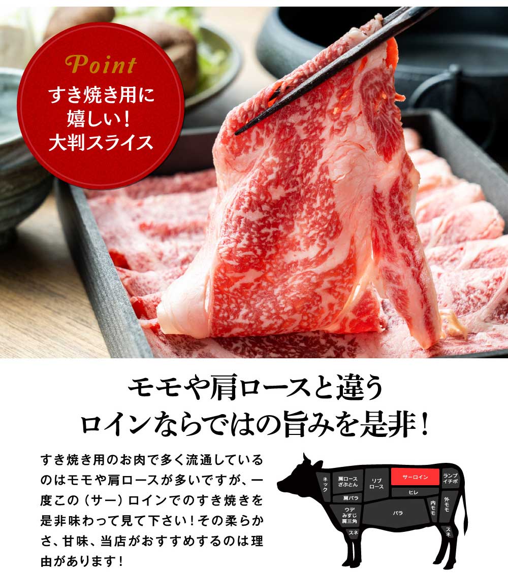 牛肉の中でも特にサーロインの脂は肉の部位の中でも一番上等とされています!口にした瞬間、上品な甘みが口いっぱいに広がりますので、すき焼きにした時には存分に旨味が感じることができます。良いお肉だからこそシンプルな味付けで味わって頂きたい!更に、とろけた脂が鍋全体に染み渡り、全ての食材を美味しく仕上げます!