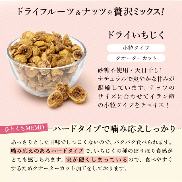 ●本品に使用しているドライいちじくは、硬めの種類になります。歯などを痛めぬようご注意ください。