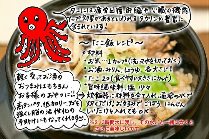 また、タコ飯レシピもありますので、皆さんでお楽しみくださいませ。