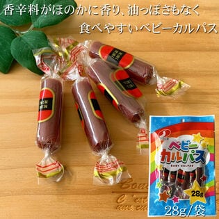 ベビーカルパス28g:鶏肉(国産)、豚脂肪、豚肉、糖類(粉末水あめ、砂糖)、植物性たん白(大豆を含む)、食塩、香辛料/調味料(アミノ酸等)、リン酸塩(Na)、pH調整剤、酸化防止剤(V.C)、保存料(ソルビン酸K)、発色剤(亜硝酸Na)