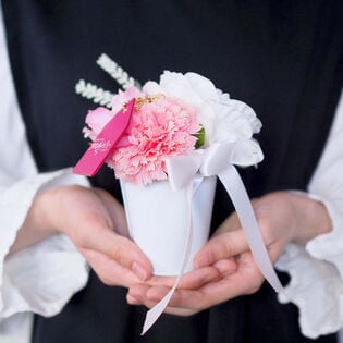 どこにでも飾れる手のひらサイズ。さりげない心遣いを贈ります。深いピンクのカーネーションとバラでまとめたベリーピンク、明るいピンクのカーネーションに白いバラをアレンジしたスイートピンクの2色があります。お母さんに似合う色で選んであげてくださいね。