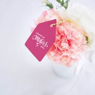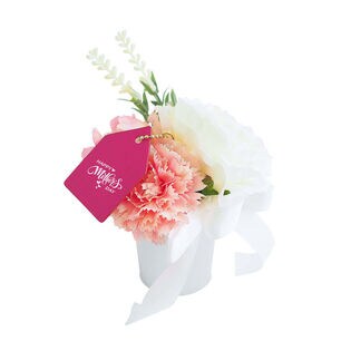 大好きなお母さんへ。定番のカーネーションに今年は機能性も加えて、ココロにもカラダにもちょっとうれしいプレゼント。CT触媒加工を施した、空間がぱっと明るくなる華やかなアーティフィシャルフラワーのプチアレンジメントです。素朴なバケツ型のポットに入れて、リボンをかけたカーネーションとバラのアレンジメント。オリジナルデザインの母の日ロゴ入りのタグもあしらいました。紙製ではなくしっかりしたレザーの質感をもつタグなので、長い間きれいに飾ってもらえます。