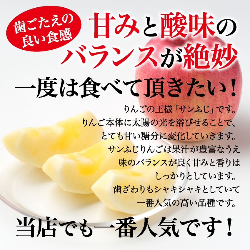 サンふじの大きさは350-400gほどで、果汁が豊富なうえ味のバランスが良く甘味と香りはしっかりとしています。歯触りもシャキシャキと心地よく人気が高いリンゴです。