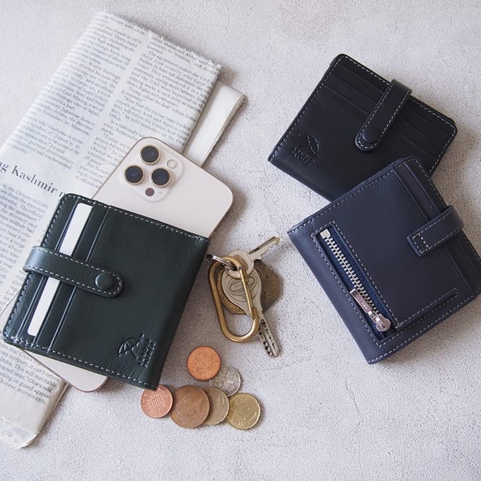必要なものをきちんと収納しつつ、ホックひとつでしっかりホールド。薄く軽く小さく纏められた薄型財布です。