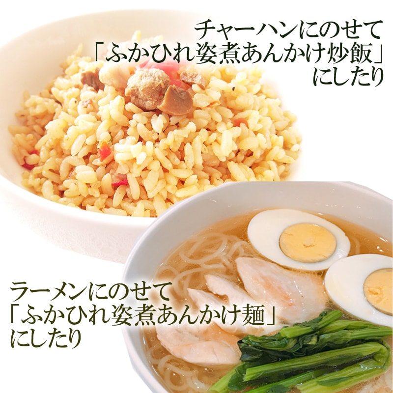 お手軽簡単に、高級レストランの味が堪能できる、贅沢なふかひれの姿煮。ご飯にのせて「ふかひれ丼」や、チャーハンにのせて「ふかひれ姿煮あんかけ炒飯」や、ラーメンにのせて「ふかひれ姿煮あんかけ麺」など、料理のバリエーション豊富にお楽しみいただけます。