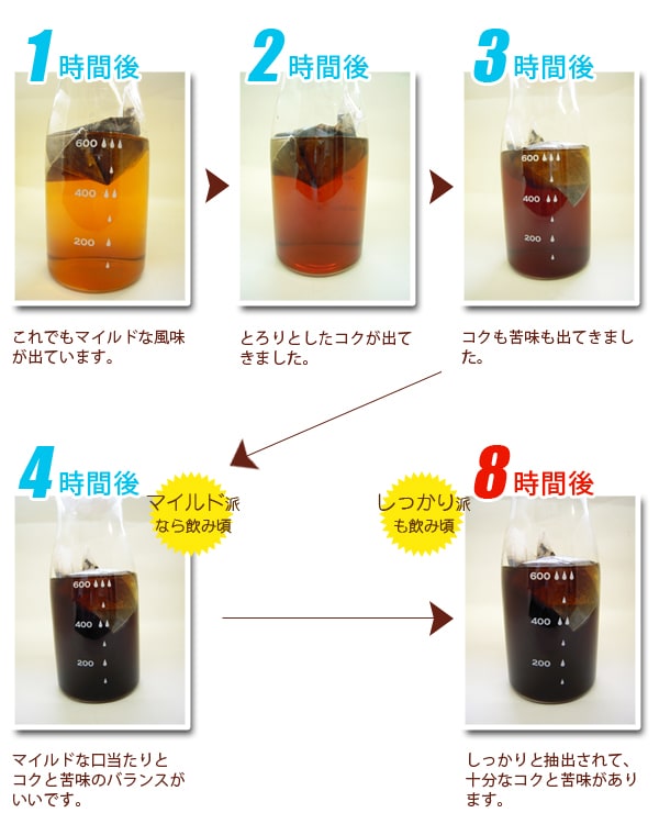 お水600ccあたり1バッグ(約5杯分)を一晩(約8時間)お水に浸しておくだけで美味しいアイスコーヒーができあがります。