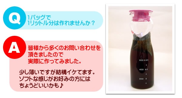 お水600ccあたり1バッグ(約5杯分)を一晩(約8時間)お水に浸しておくだけで美味しいアイスコーヒーができあがります。