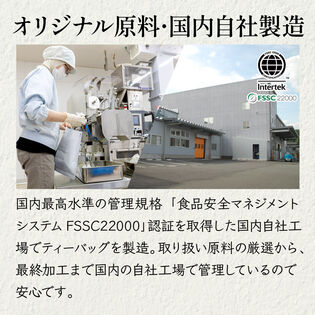 国内最 高水準の管理規格「食品安全マネジメントシステムFSSC22000」認証を取得した工場でティーバッグを製造。取り扱い原料の厳選から、最終加工まで国内の自社工場で管理しているので安心です。