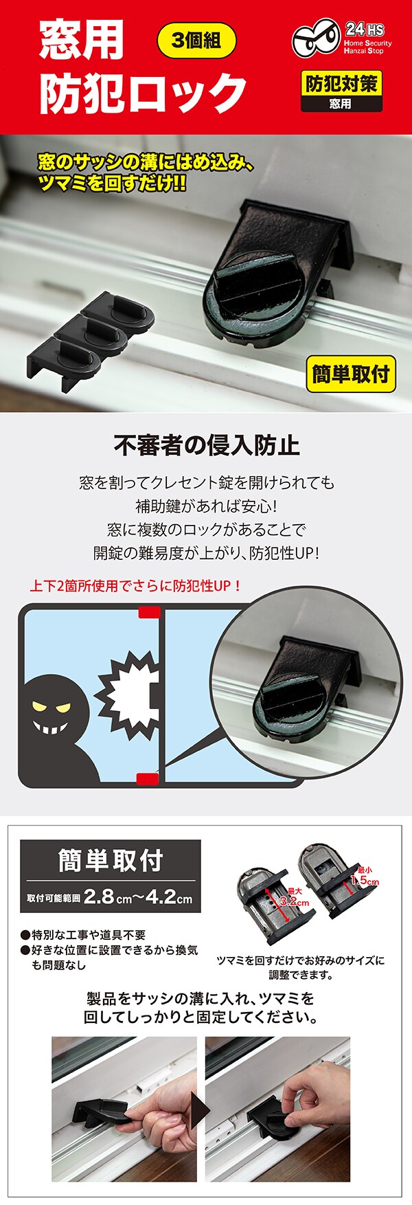 【3個組/ブラック】窓用 防犯ロック | 防犯対策グッズ!ご自宅やオフィスの天井に!! 赤色LEDが常時点滅仕様。