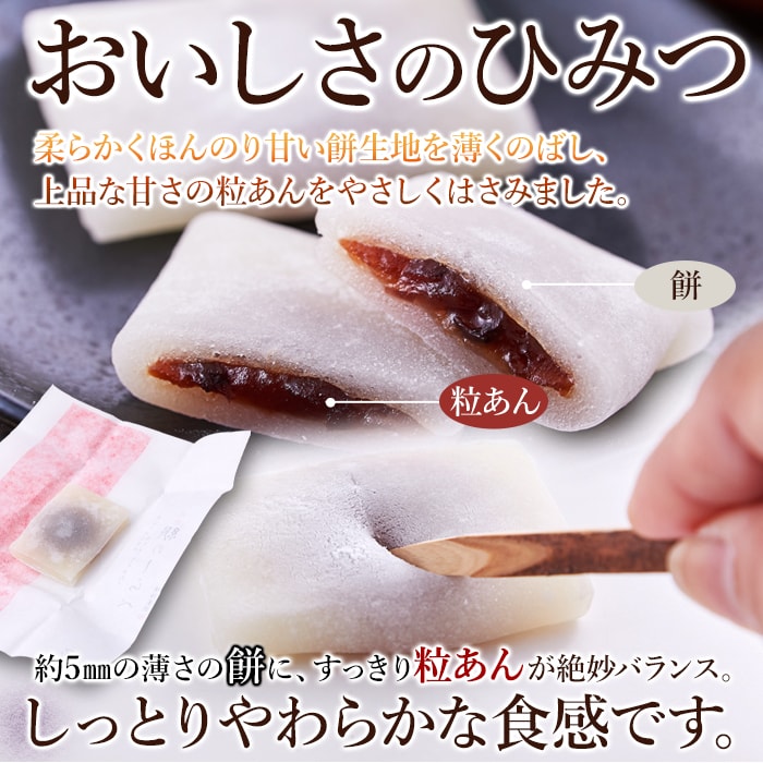 約5mmの薄さの餅に、すっきり粒あんが絶妙バランス。