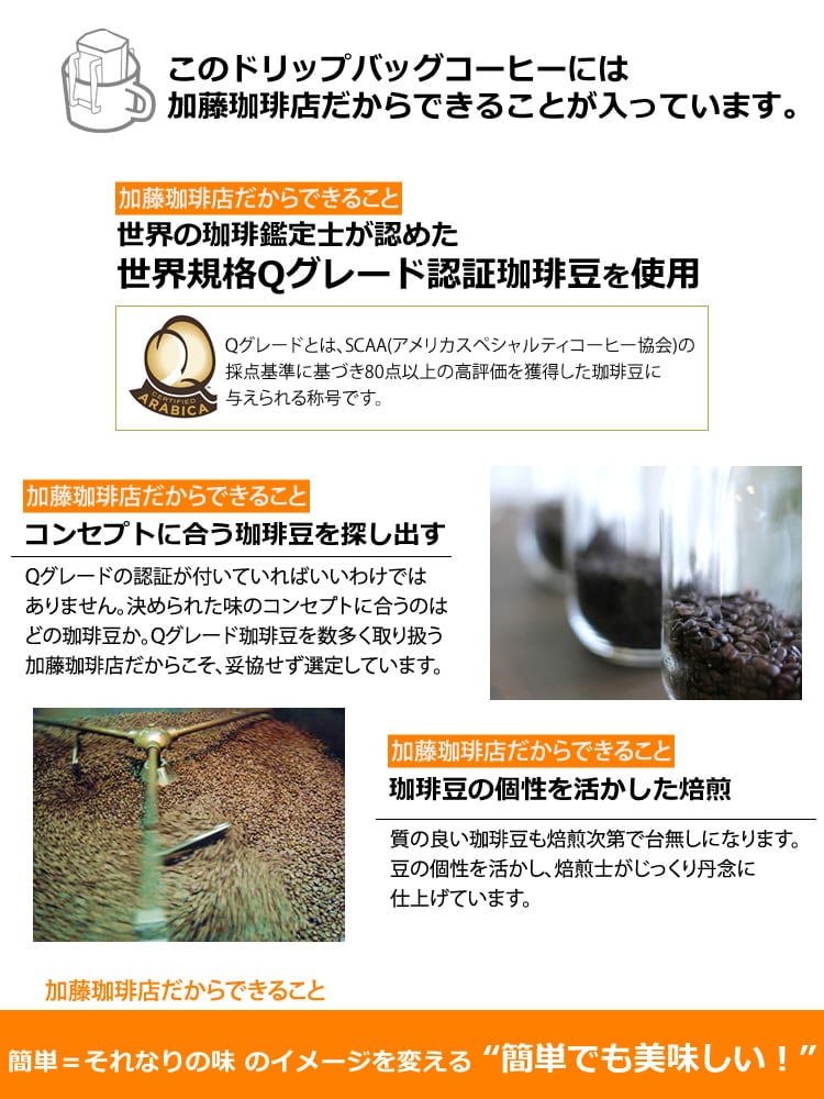 “簡単でも美味しい!”Qグレード珈琲豆を数多く取り扱う加藤珈琲店だから作れるドリップバッグコーヒーからお好みのお味を100杯分お届けします。