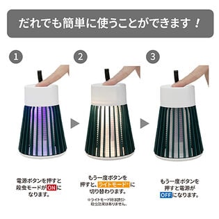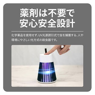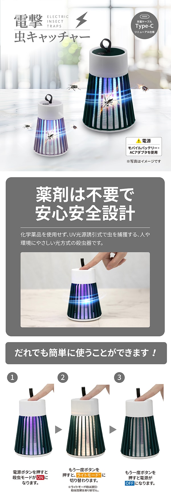 ・注意事項:●本製品は、効果を100%保証するものではありません。虫の種類や設置環境によって誘引されない場合があります。また、日中に使用される場合は光による誘引効果が十分に得られない場合があります。●本来の用途以外では使用しないでください。●ガードの中に指や異物を絶対に入れないでください。●火気の側や引火性のガスのある場所、雨や水しぶきがかかる場所では使用しないでください。●異臭や発煙が発生した場合は直ちにご使用及び充電を中止してください。●本体を丸洗いしないでください。●踏んだり、落としたり、ぶつけたりしないでください。●水分や静電気を帯びた手で触れないでください。●お手入れは必ず充電ケーブルを抜いた状態で行ってください。●本体の上に重いものを置かないでください。●小さいお子様の手の届かない所で使用・保管してください。●使用しない時は必ず充電ケーブルを抜いた状態で保管してください。●直射日光や高温多湿、ほこりの多い場所を避けて清潔な場所に保管してください。●分解や改造をしないでください。●本製品の使用による、接続する機器のデータ損失や破損については、弊社は一切の責任を負わないものとします。