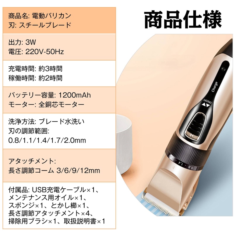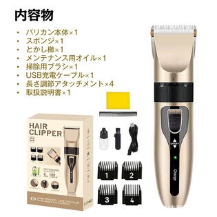 付属品:USB充電ケーブル*1、メンテナンス用オイル*1、スポンジ*1、とかし櫛*1、長さ調節アタッチメント*3、掃除用ブラシ*1、取扱説明書*1,