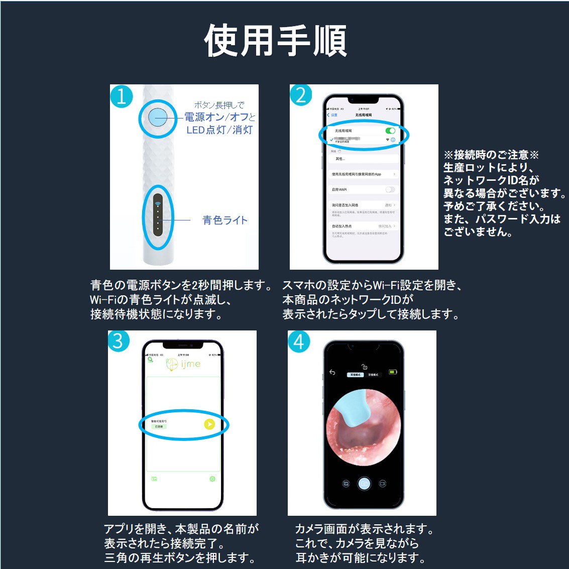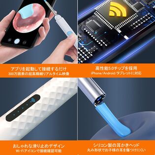 Wi-Fi接続によりスマートフォンやタブレットで耳の中が見える、カメラ付きの耳かきです。