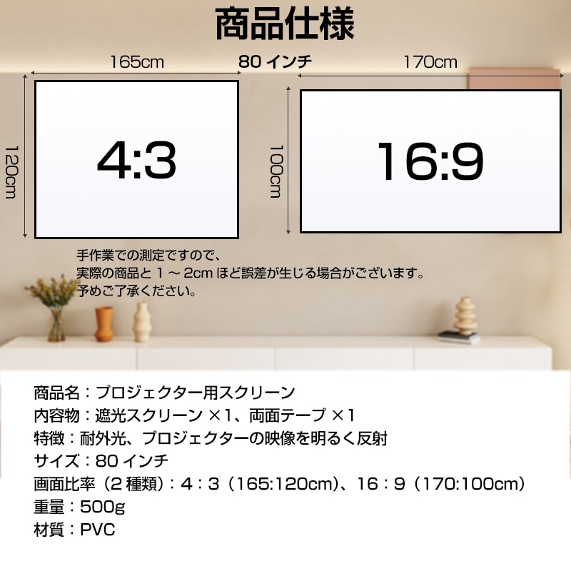 画面比率(2種類):16:9(170*100cm)、3:3(165*120cm),