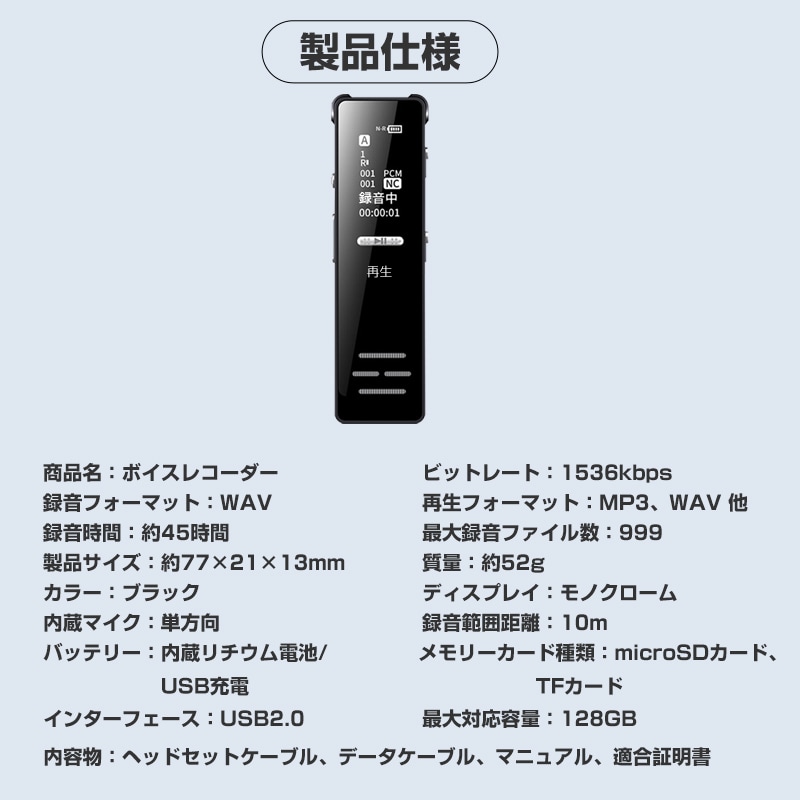 内容物:イヤホン×1、USBケーブル×1、マニュアル×1、8gBメモリカード×1、ボイスレコーダー本体×1