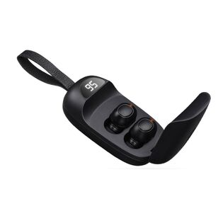 紛失防止ロープと充電残量表示ありの充電ケースはポケットに入れて持ち運べる。