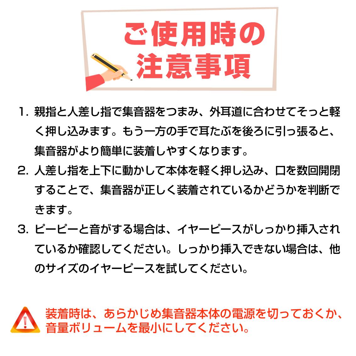 ※急性外耳炎/鼓膜炎/慢性化膿性中耳炎/急性化膿性中耳炎/真珠腫性中耳炎/突発性難聴(急性期)/外耳道真菌症/耳栓により外耳道に傷や出血がある方/その他 耳や聴覚に関わる急性の病状がある方は利用しないで下さい。