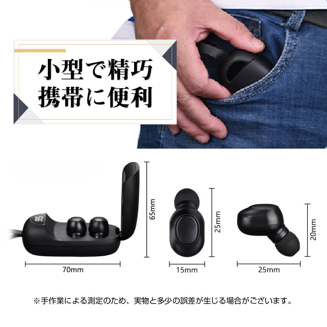ワイヤレスイヤホンのような見た目で目立たない。ワンタッチで操作簡単。