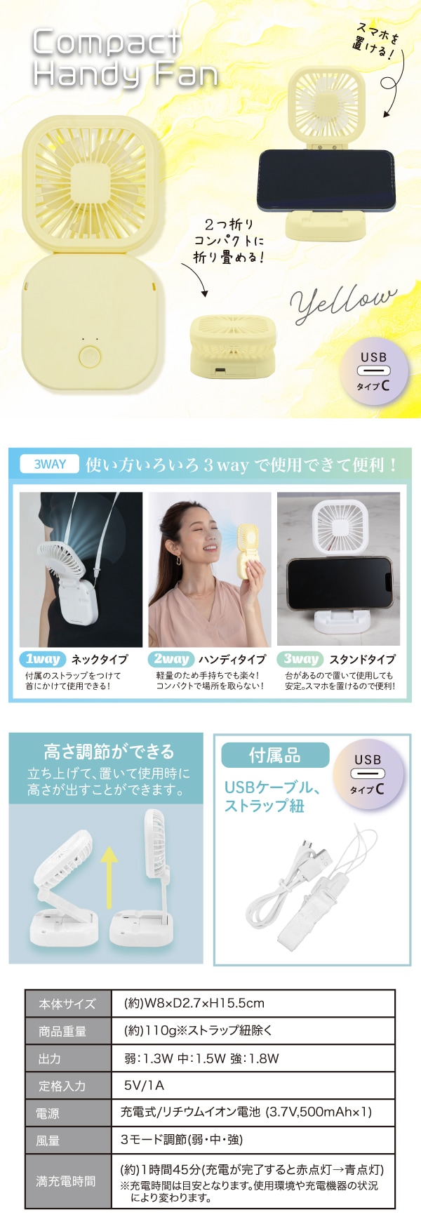 【イエロー】2つ折りコンパクトハンディファン | この夏はおしゃれに涼もう