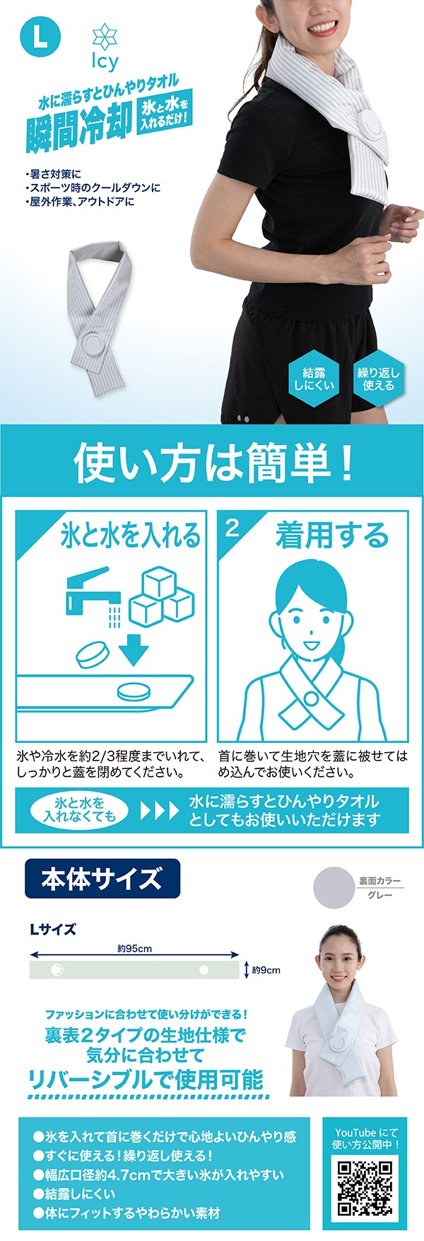 【ストライプベージュ/L】Icy氷嚢マフラー | 水に濡らすとひんやりタオル!瞬間冷却