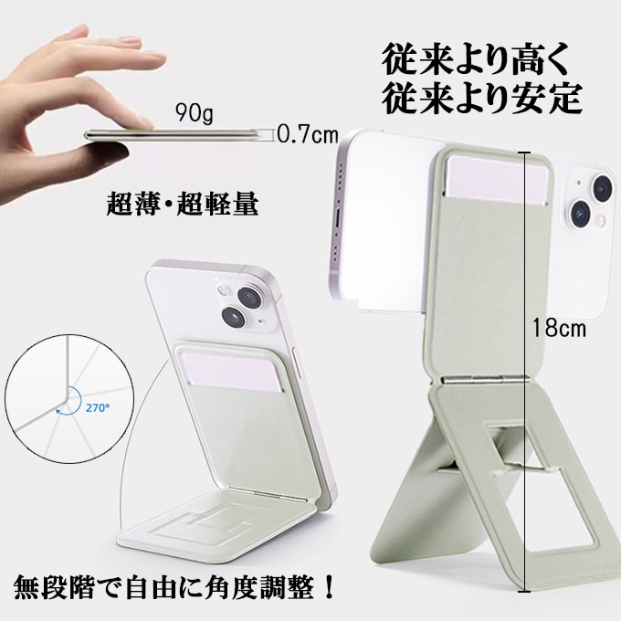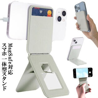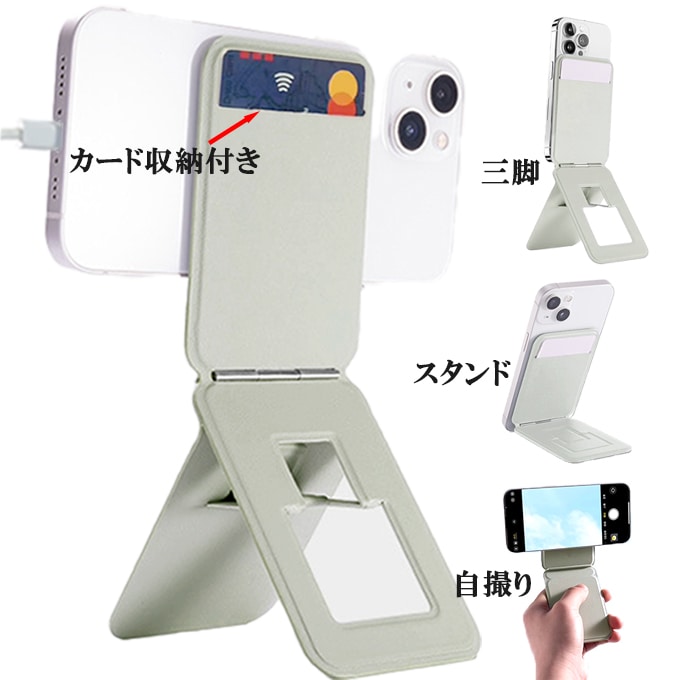 【グレー】Magsafe対応 スマホ一体型スタンド | スマホスタンド 薄型 折りたたみ カード収納 三脚 自撮り 多角度 iPhone対応