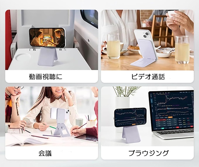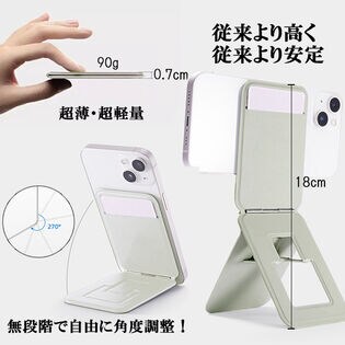 わずか0.7cmの薄さでカードサイズに折りたたみ可能。使用時にはサッと広げて、スマホスタンドとして活躍します。底面には三角形の構造を採用し、高い安定性を実現。