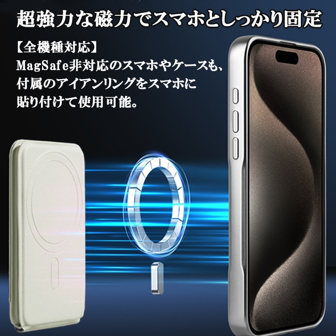 MagSafe対応機種(iPhone16/15/14/13/12シリーズ)に装着可能。縦置き・横置き・フローティングモードに自在に切り替えられ、シーンに応じた使い方が楽しめる。MagSafe対応してない機種でも付属のアイアンリングを使って装着可能になる。
