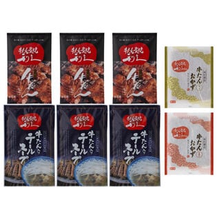 - 牛たん真空パック(塩味)100g×3、冷凍牛たん入りテールスープ250g×3、牛たんおかず塩味120g、牛たんおかず味噌味120g