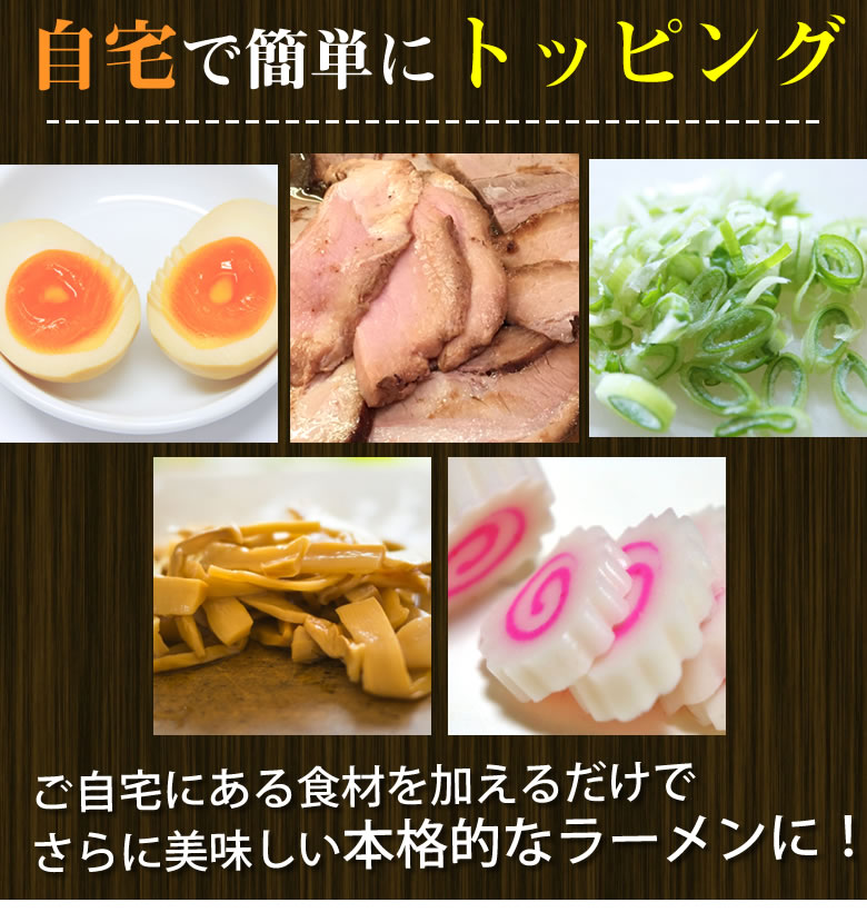 スープ:醤油、ニボシエキス、胡麻油、食用植物油、砂糖・ぶどう糖果糖液糖、食塩、鰹節エキス、ポークエキス、香辛料、発酵調味料、焼きあご/調味料(アミノ酸等)、増粘剤(キサンタンガム)。(一部に小麦・大豆・豚肉・ごま・さばを含む)