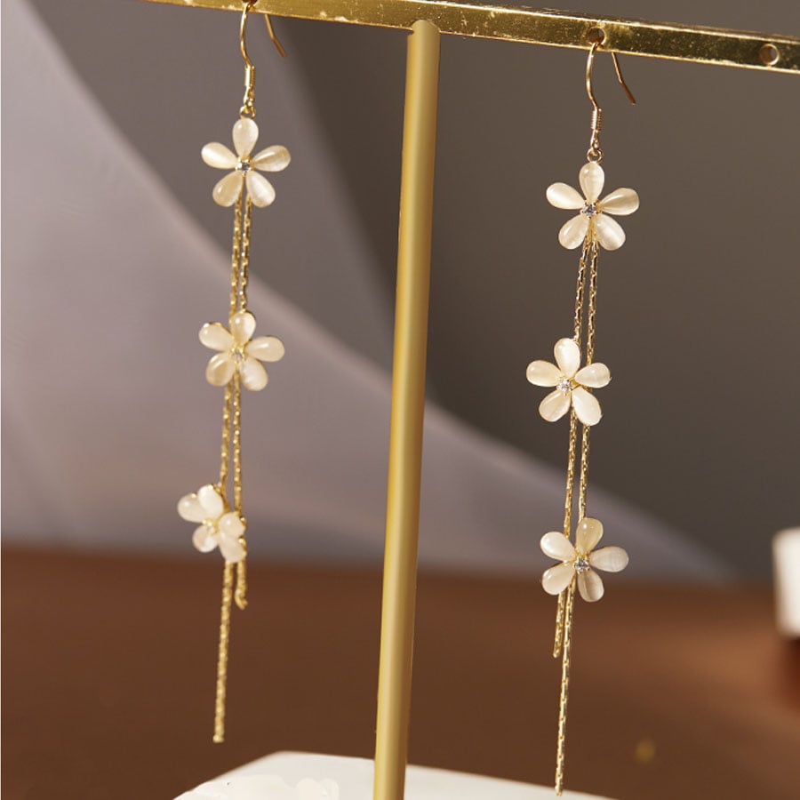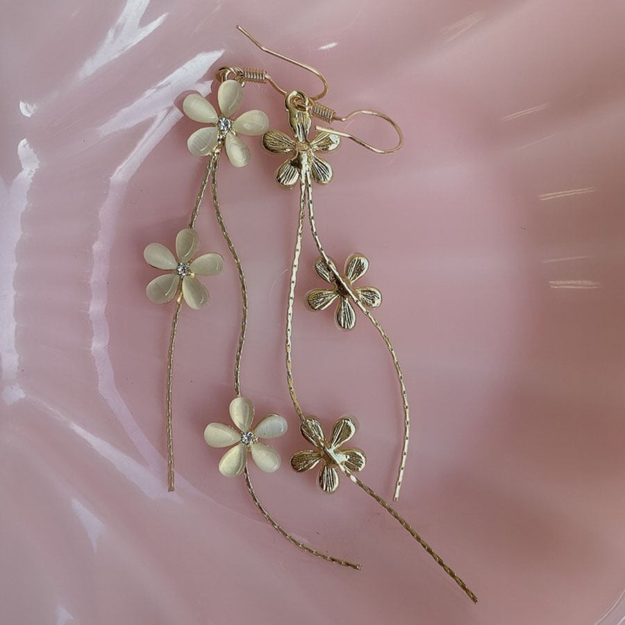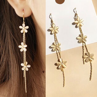 大人フェミニンな花を3つ連ねた揺れるロングピアス。