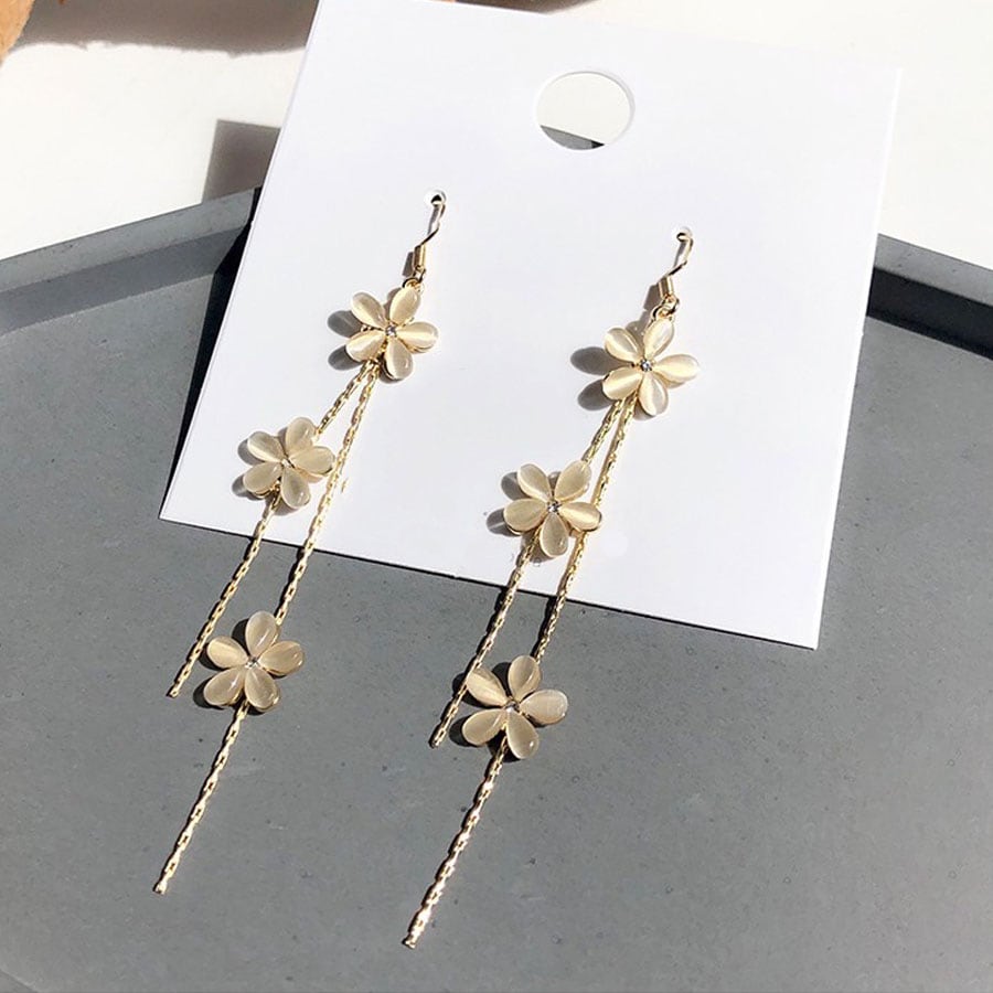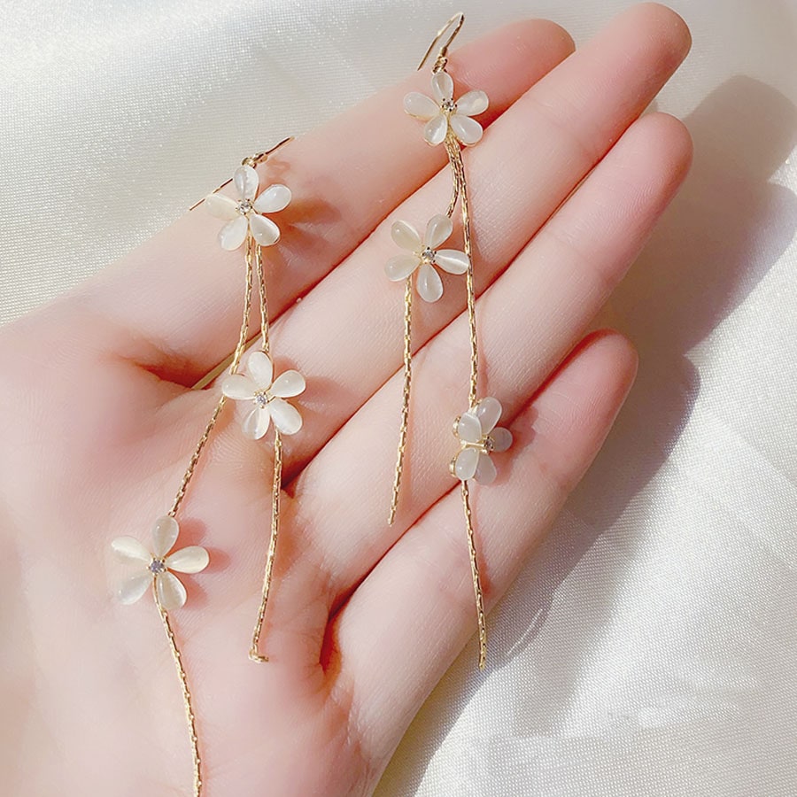 大人フェミニンな花を3つ連ねた揺れるロングピアス。